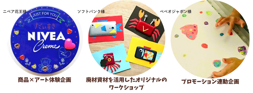 | ①イベント目的に合わせたさままざまなワークショップをご提供 ②企業、教育期間、官公庁、商業施設など、 開催場所と対象年齢を考慮したワークショップ内容 ③講師は、キッズワークショップ指導者のプロ ④雑誌、テレビ番組、企業などで指導してきた かまゆみ監修の ワークショップ |